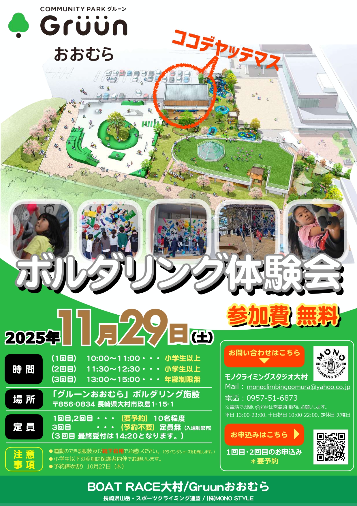 【定期開催 11月29日 ボルダリング体験会】 グルーンおおむら 2025年10月28日 - 予約状況などお問い合わせは 『モノクライミングスタジオ大村(TEL:0957-51-6873)』 までお願い致します