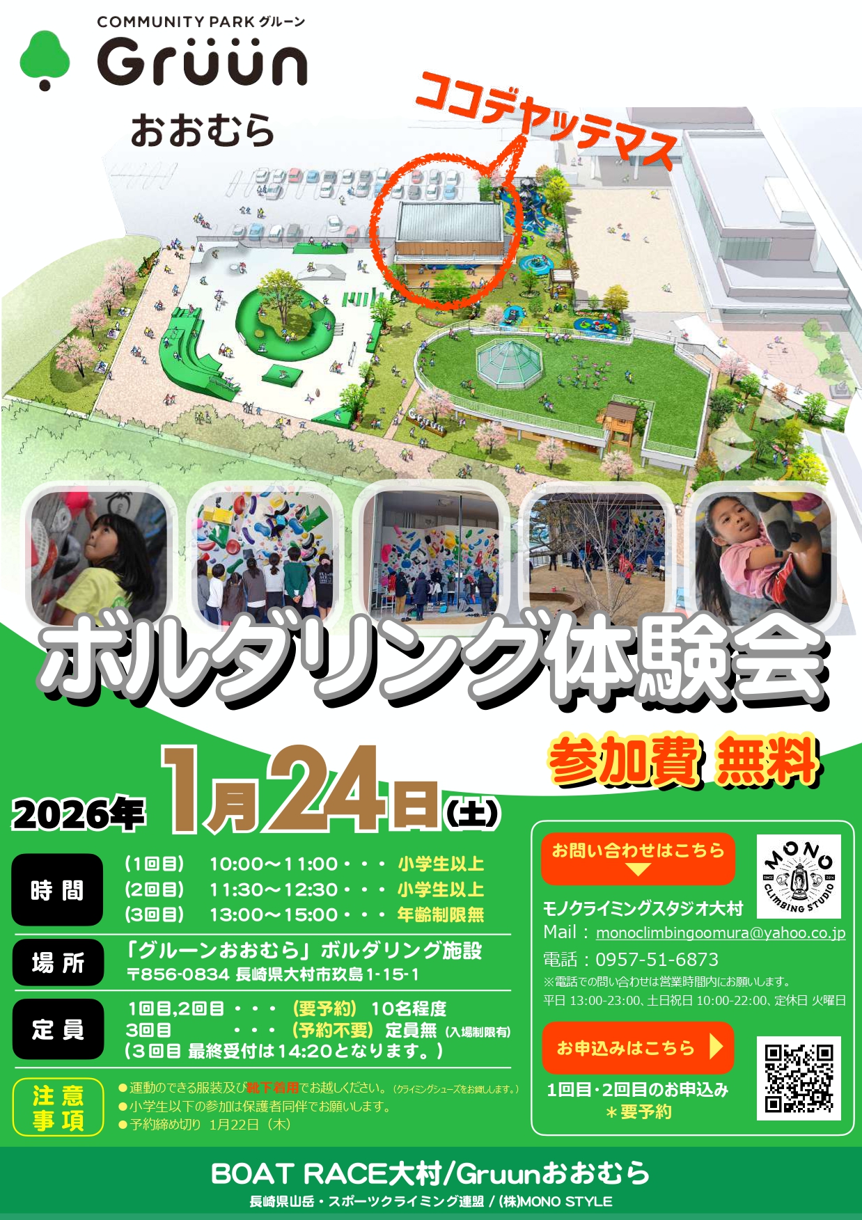 【定期開催 1月24日 ボルダリング体験会】 グルーンおおむら 2025年12月29日 - 予約状況などお問い合わせは 『モノクライミングスタジオ大村(TEL:0957-51-6873)』 までお願い致します