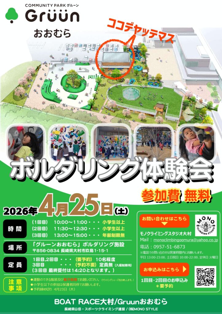【定期開催 4月25日 ボルダリング体験会】 グルーンおおむら 2026年3月30日 - 予約状況などお問い合わせは 『モノクライミングスタジオ大村(TEL:0957-51-6873)』 までお願い致します